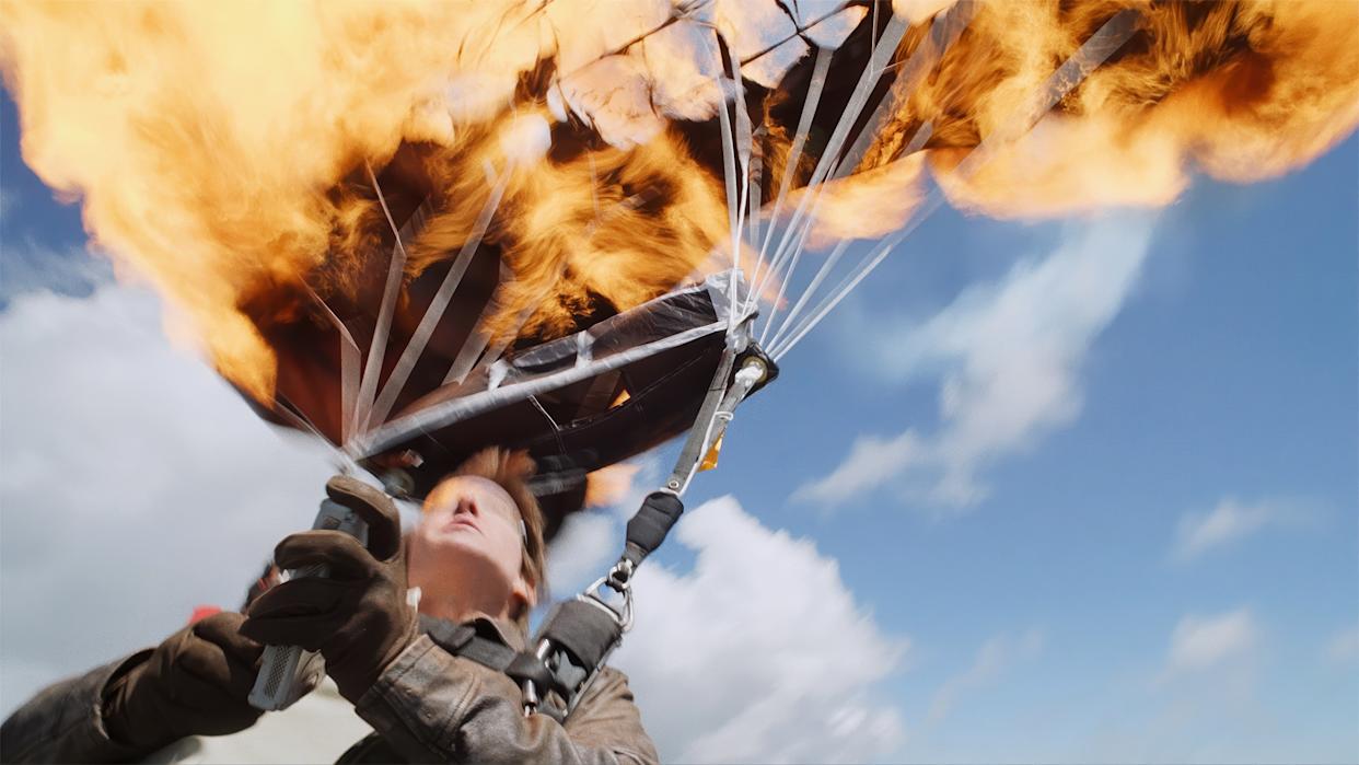 ฉากนี้ถ่ายทำในเทือกเขาดราเคนส์เบิร์ก ประเทศแอฟริกาใต้ โดยมีการเตรียมความพร้อมอย่างเข้มงวดหลายสัปดาห์ ซึ่งเฮลิคอปเตอร์ต้องพา ทอม ครูซ ขึ้นไปถึงความสูงอย่างน้อย 7,500 ฟุต ก่อนที่เขาจะกระโดดลงมาพร้อมร่มที่ชุบเชื้อเพลิงไว้ล่วงหน้า เมื่อร่มติดไฟ เขาต้องปลดร่มหลักทันทีและเปิดร่มสำรองเพื่อร่อนลงอย่างปลอดภัย ซึ่งต้องทำทุกขั้นตอนนี้ภายในเวลาไม่กี่วินาที