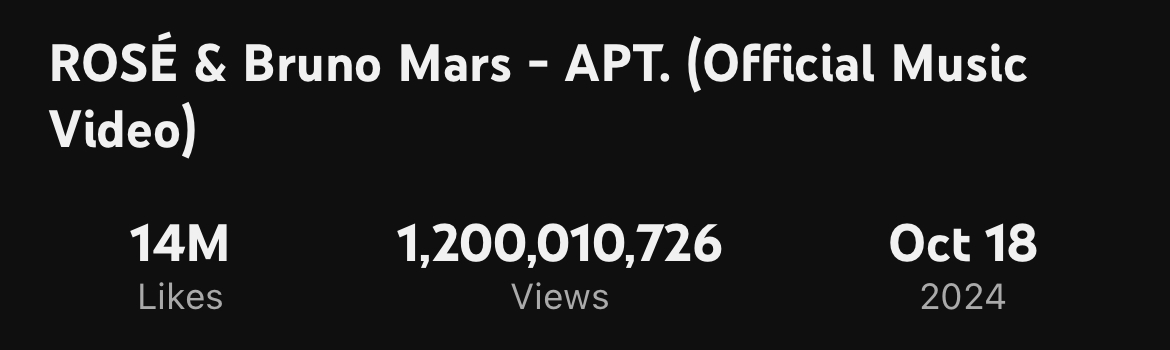 มิวสิกวีดีโอเพลง APT. ของ โรเซ่ จากวง BLACKPINK และบรูโน่ มาร์ส ยังคงทำลายสถิติอย่างต่อเนื่อง โดยล่าสุดสามารถทำยอดวิวทะลุ 1.2 พันล้านวิวได้ภายในระยะเวลาเพียงแค่ 131 วันและอีก 8 ชั่วโมง เท่านั้น ซึ่งถือเป็นการทำลายสถิติสำหรับมิวสิกวีดีโอของศิลปินเอเชียที่มียอดวิวสูงสุดในเวลาอันรวดเร็วที่สุด